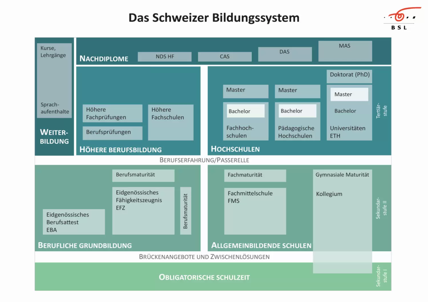 Eine erfolgreich absolvierte Ausbildung auf Sekundarstufe II (Berufliche Grundbildungen EFZ, Fachmittelschule, Gymnasium) ermöglicht den Zugang zu Weiterbildungen auf der sogenannten Tertiärstufe. Diese gliedert sich in die zwei Bereiche "Höhere Berufsbildung", auch "Tertiärstufe B" genannt, und "Hochschulen", auch "Tertiärstufe A" genannt:
